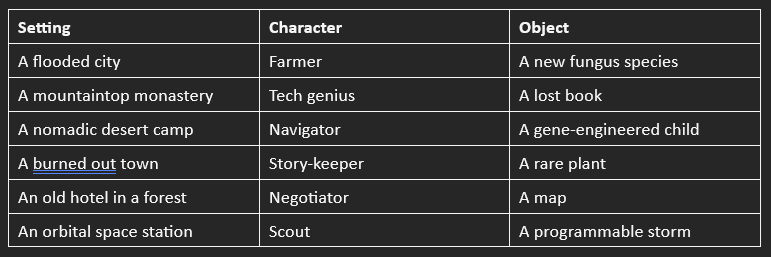 Get a die, roll it three times, once for each column, and ta da! There’s your starting points for a story. See what questions come to mind and what you can build around these seeds. (yes I know a child isn’t an object per se. I was going to change it to a cat (also not an object tbf) and forgot. So consider it a schrodinger’s child/cat)
