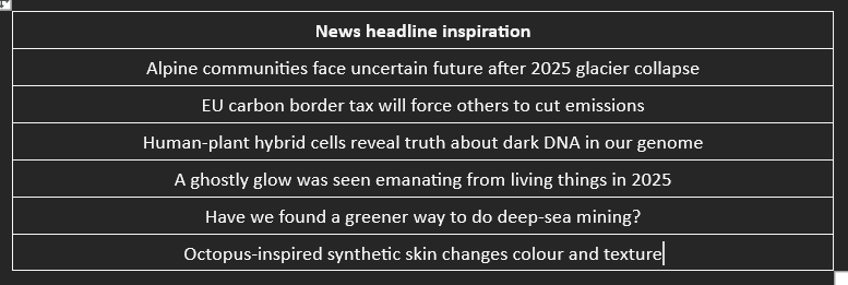 From some recent New Scientist articles, pick one of these and keep poking it with a ‘What if?’ stick until you get past the first obvious ideas into something that feels fresh and intriguing. Like – What if a carbon border tax was on people not trade…, yes and now what if we paid in flesh/seeds/labour/lifespan…, yes and now what does that mean for this, and this, and… Just keep chasing that curiosity until something fun sparks.