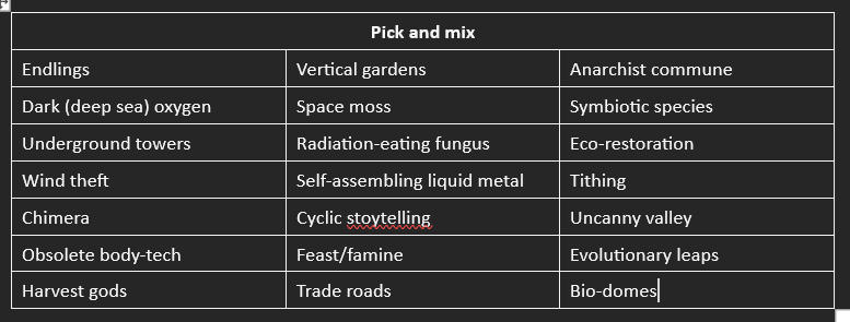 Pick 2 or 3 of these random ideas, phrases, bits of tech or concepts, mash them together and see whether anything fun emerges from the chaos! If you’re struggling pick a historic era & imagine something from that time period in the future (solarpanel crinolines, anyone?), or a favourite piece of folklore (cat sidh but make it a manifestation in the space orbital), see if that helps something emerge.